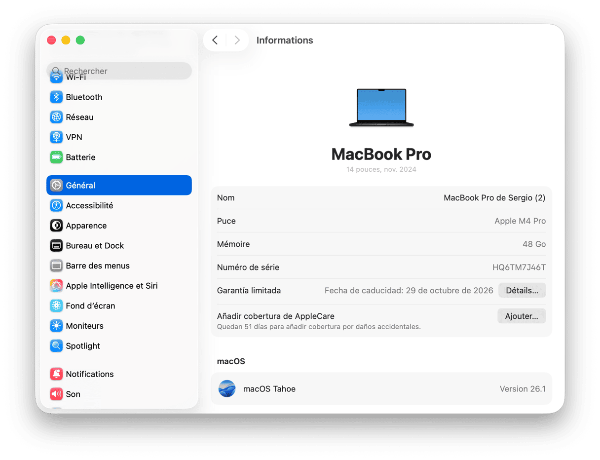 Vous pouvez aussi jeter un coup d'œil à la quantité de mémoire dont vous disposez actuellement sur votre Mac dans les Réglages Système > Général > À propos.