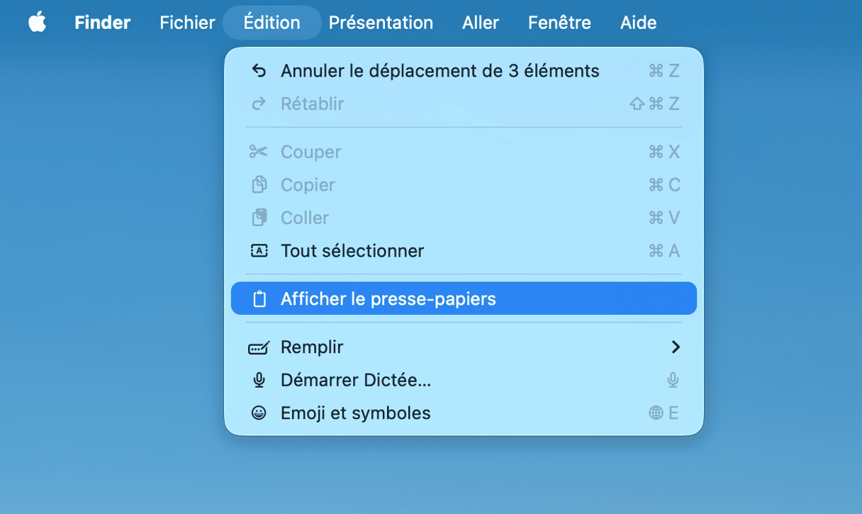 Le presse-papiers de votre Mac n'est pas comme la mémoire à court-terme des êtres humains. Il est éphémère et ne peut mémoriser qu'une chose à la fois. Une fois que l'élément n'est plus en mémoire, impossible de le récupérer. C'est pourquoi le presse-papiers ne vous permet que de coller la toute dernière chose que vous avez copiée. Vous pouvez consulter le presse-papiers depuis le menu Finder. Voici comment faire :