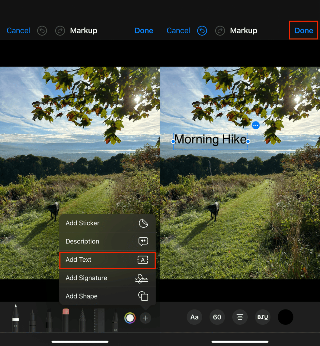 You can add text to a photo almost the same way you add a sticker. Here's how to do it: