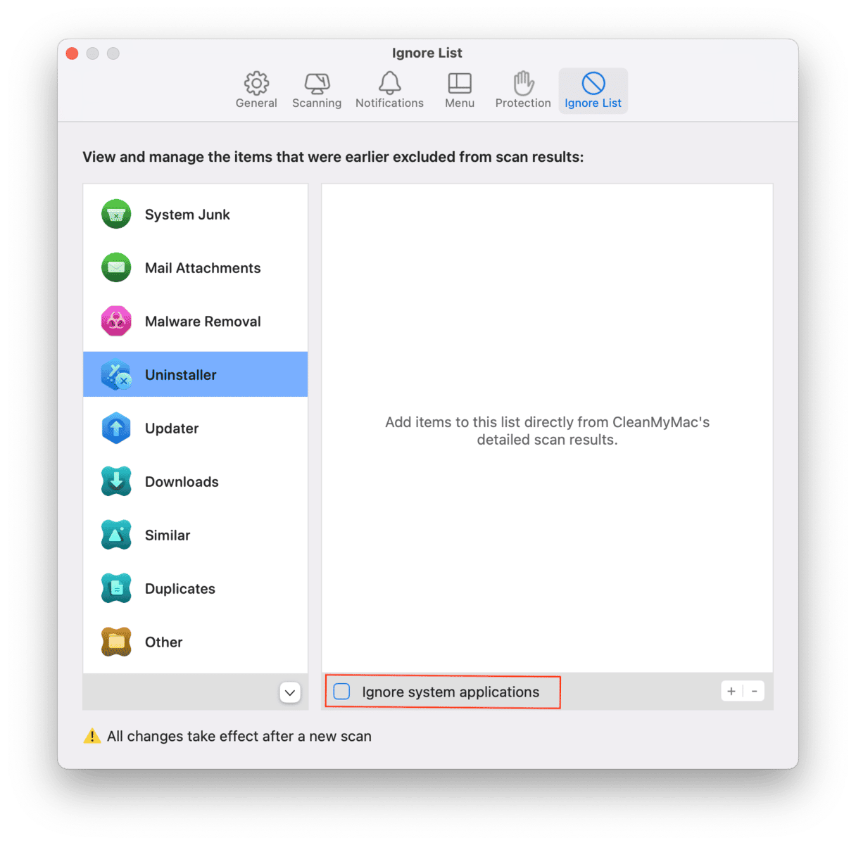 - In the menu bar, go to CleanMyMac > Settings > Ignore List > Uninstaller.
