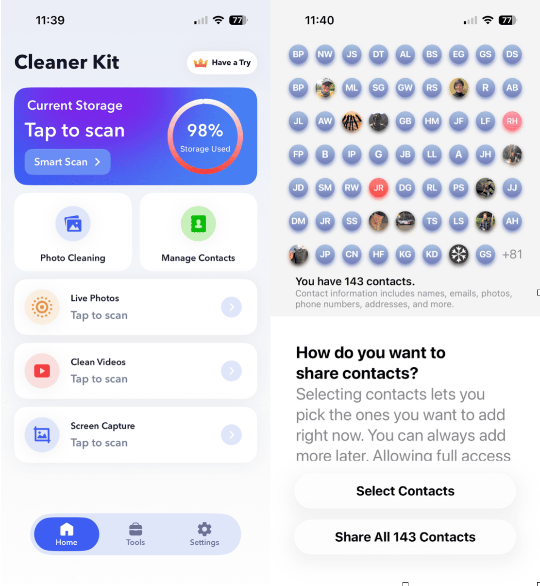 The Cleaner Kit is designed to help users regain control of their iPhone storage through AI-powered scanning and smart file detection. After installing the app, it performs a deep scan of your library and system, identifying duplicate photos, similar images, large videos, unused contacts, and even outdated calendar events.