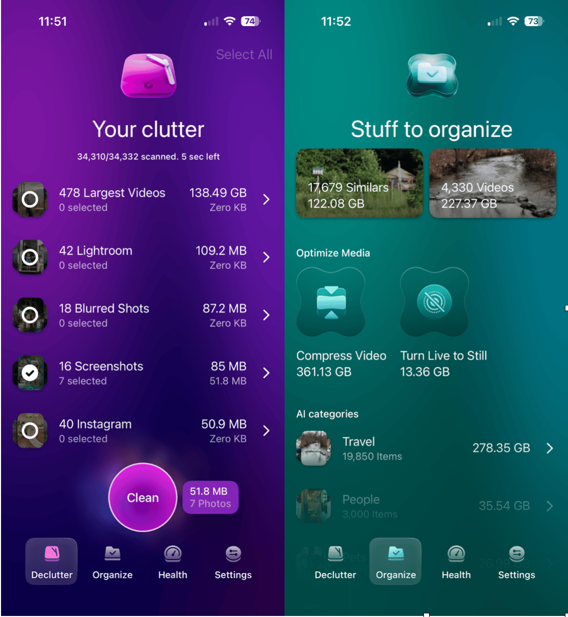 CleanMy®Phone takes a more streamlined approach. It’s designed for one core purpose: intelligently organizing, decluttering, and optimizing media. That narrower focus makes it feel cleaner, faster, and easier to use. When comparing accuracy, CleanMy®Phone did a better job of avoiding errors in grouping similar photos. It also handled large libraries with more speed and fewer hiccups.