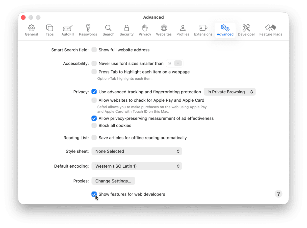 - Navigate to the Advanced tab and make sure that the box next to the "Show Develop menu in menu bar" option is selected. In macOS Sonoma and Sequoia, it is named "Show features for web developers".