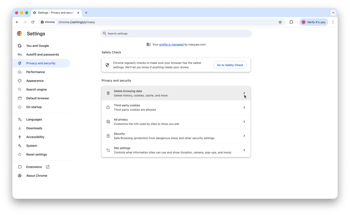 - Navigate to the "Privacy and security" section and click "Delete browsing data" there.