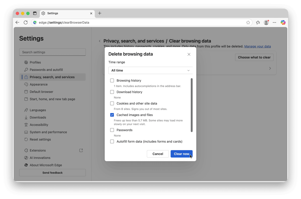 If you were wondering how to clear cookies on Mac in Edge, it is just like for two other browsers (Chrome and Firefox). All you need to do is select Cookies and other site data before clicking Clear now, and the cookies will be gone.