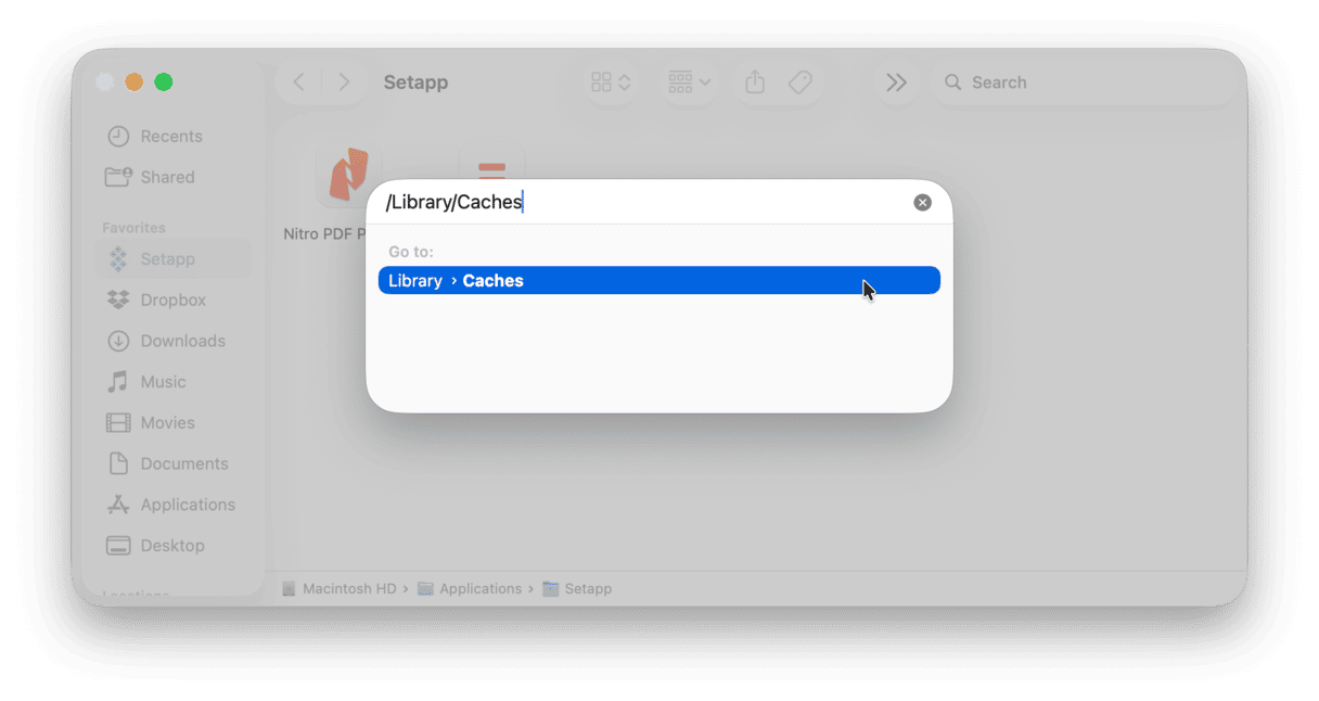 Let's start our cache-clearing journey by deleting system cache files — files built-in macOS system services generate for proper operation. To locate them, open the Finder, and from the Go menu, choose Go to Folder. Now, paste /Library/Caches