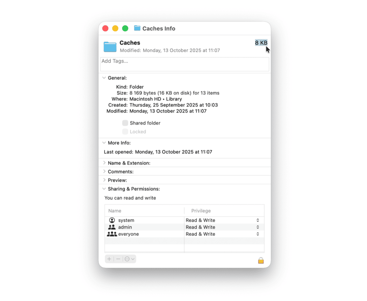 If you want to find out how much space it occupies, right-click the Caches folder and choose Get Info from the menu. You'll see the size of the folder in the info window: