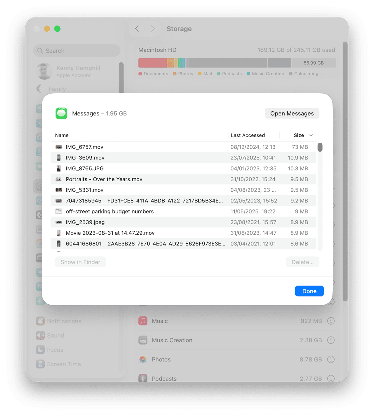 - Click the ‘i’ next to Messages — you will see a list of all the attachments stored on your Mac, along with their file sizes.