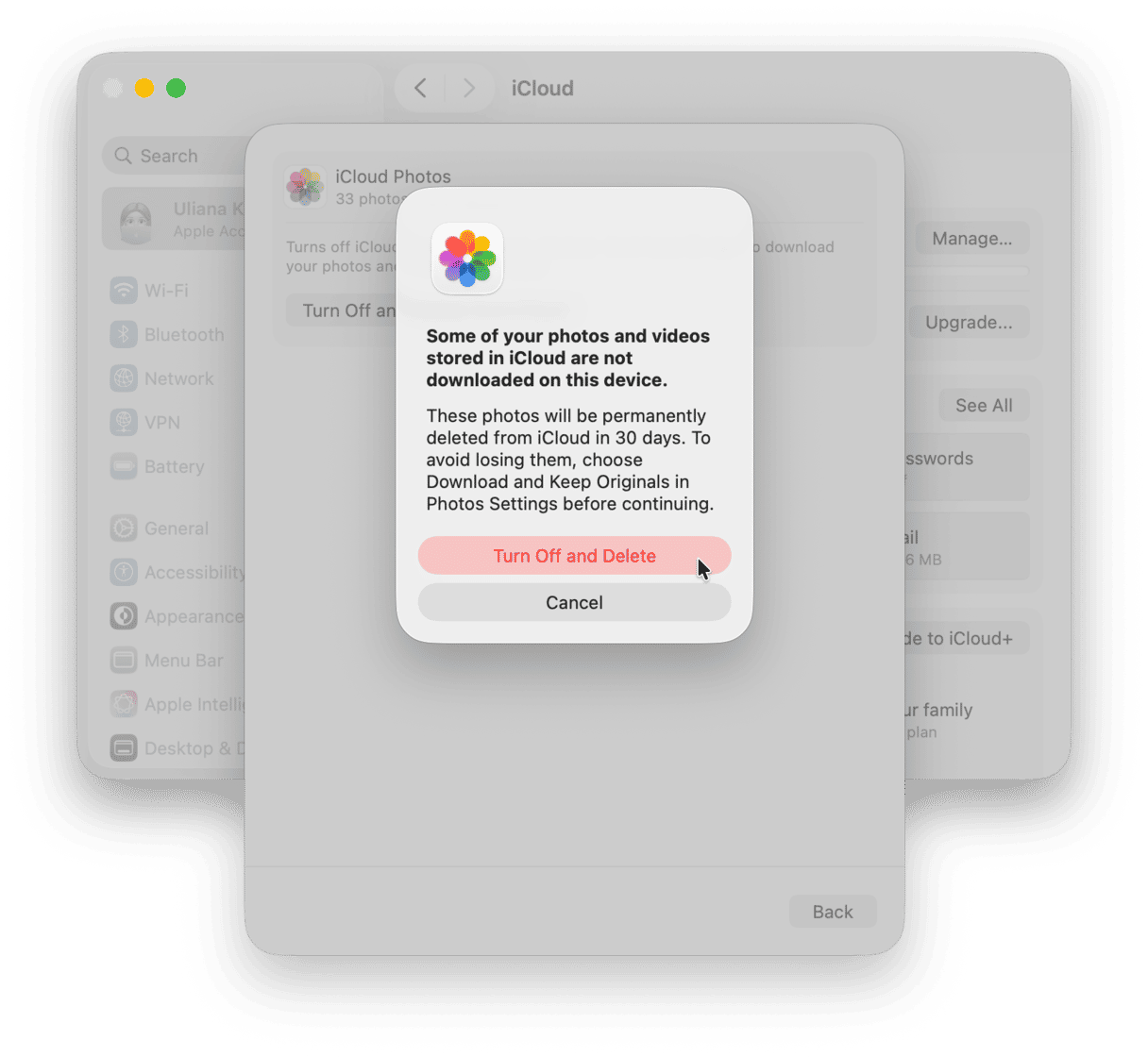- Click iCloud > Manage > iCloud Photos > Turn Off and Delete from iCloud.