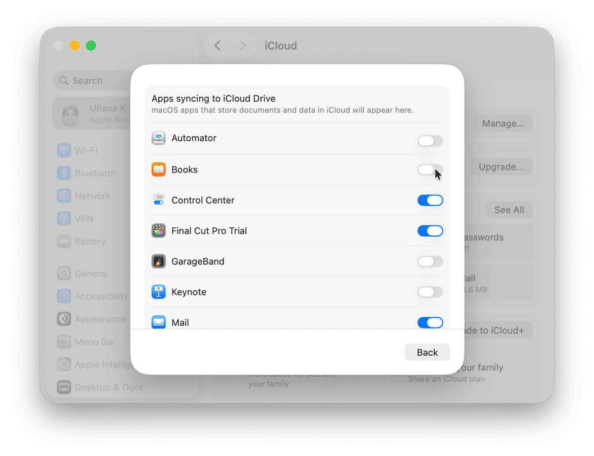 - Click Drive > Apps syncing to iCloud Drive in System Settings > Apple Account > iCloud.