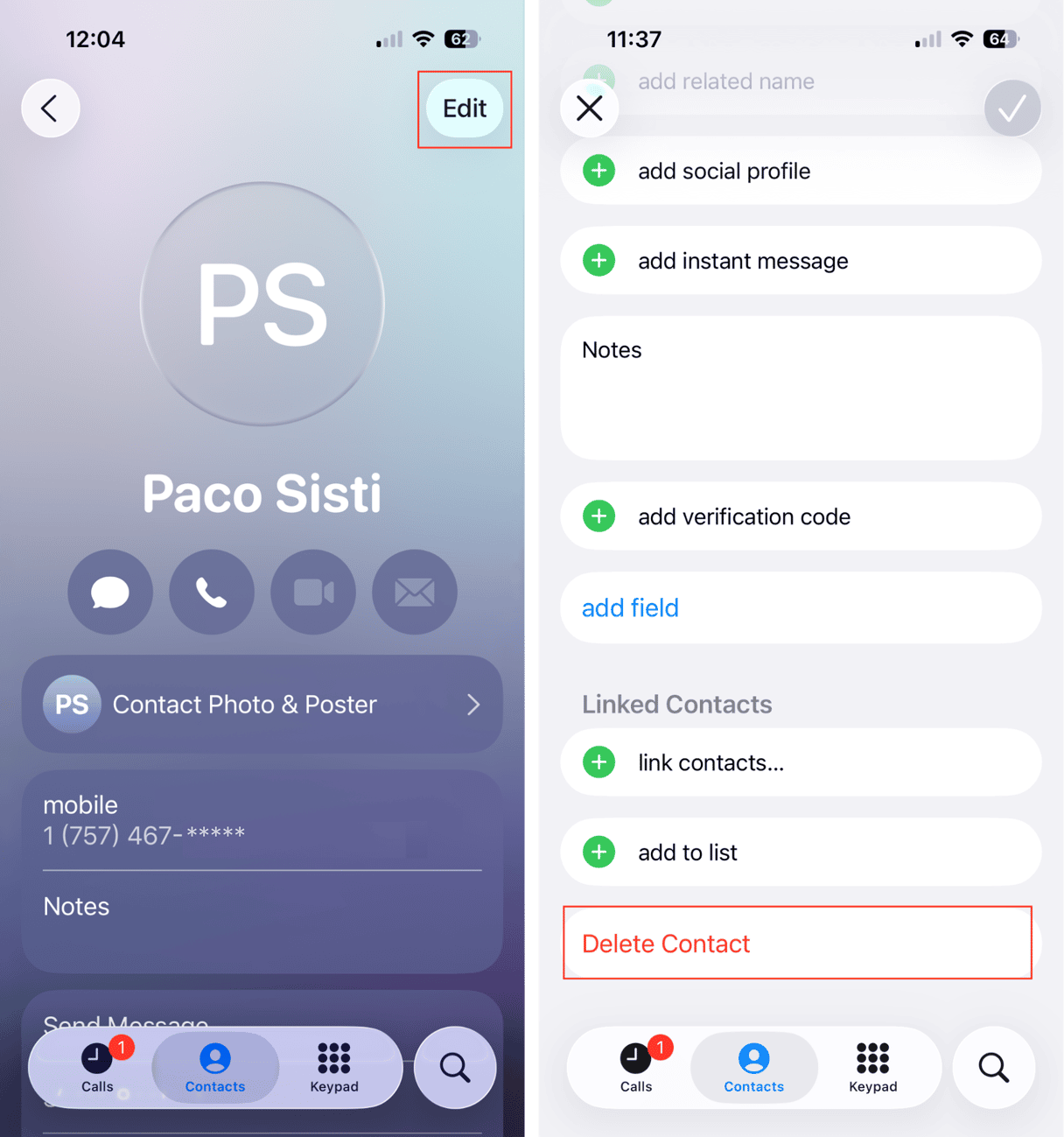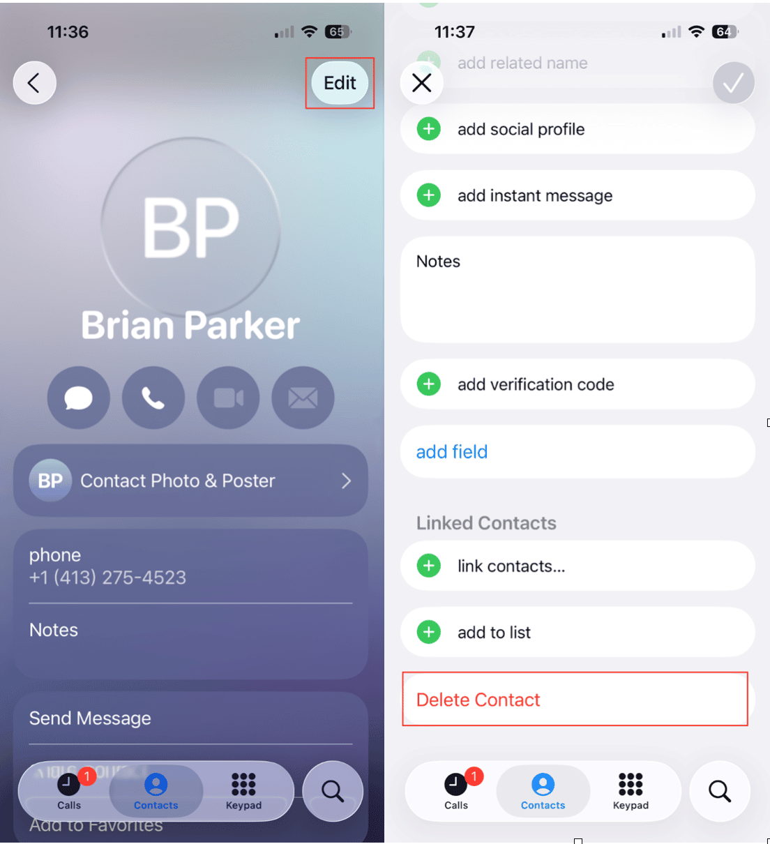 Step 4. Scroll down and tap ‘Delete Contact.’