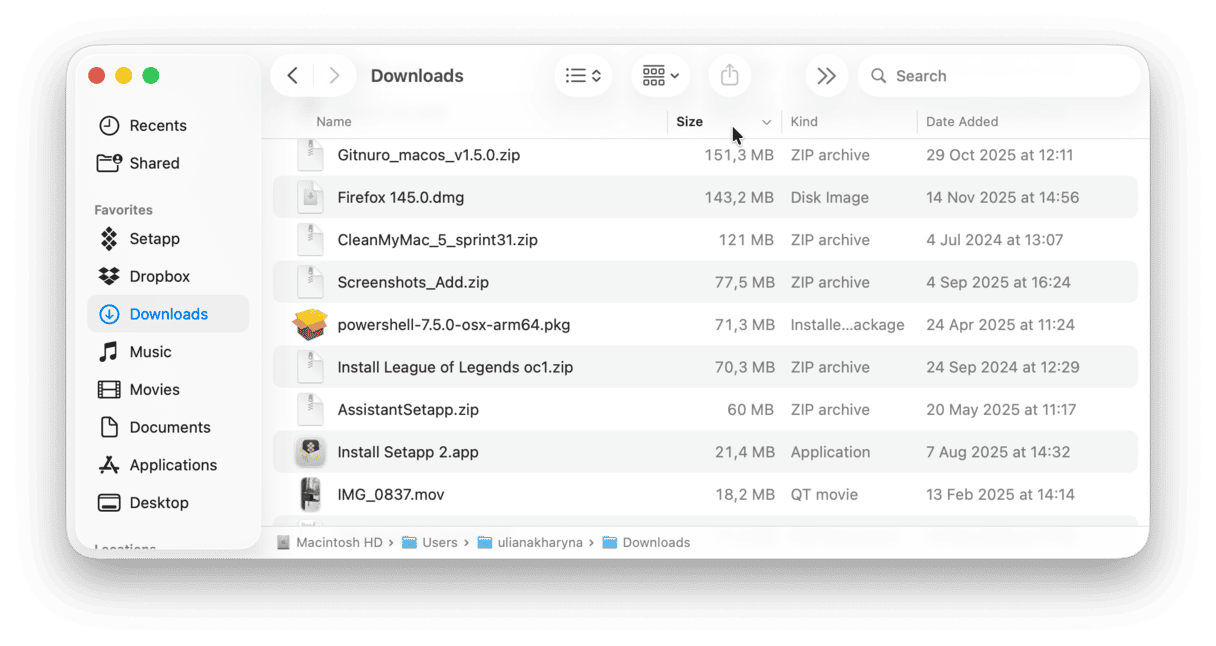 📌 The Downloads and Documents folders to delete files you no longer need and the Applications folder to get rid of forgotten apps (it's a good idea to filter files by size to spot the largest ones easily)