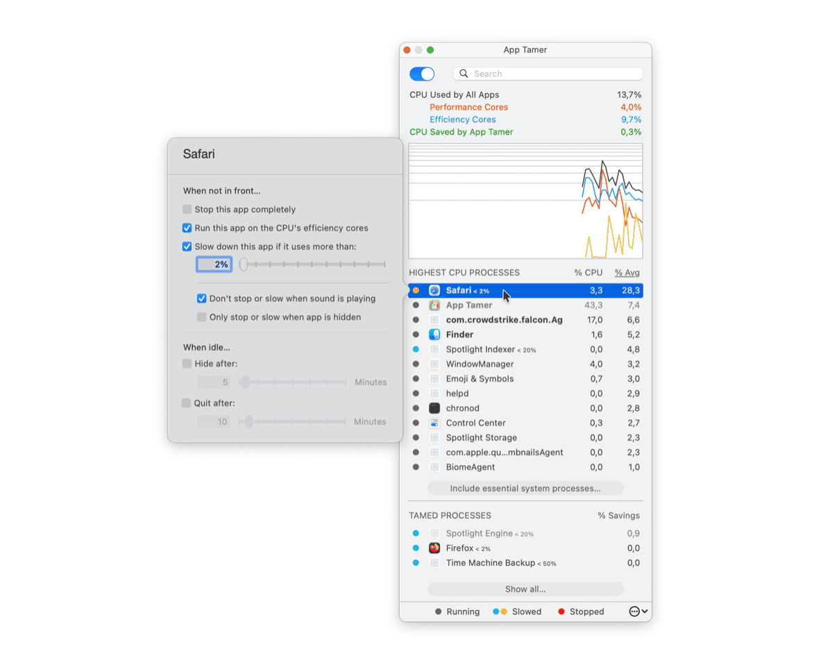 If you notice any of these dysfunctions, check what’s taking up all your CPU. Use App Tamer for that. It’s an advanced CPU monitoring solution for Mac. App Tamer allows you to track processes and put caps on any app, forcefully slowing it down to avoid system paralysis.
