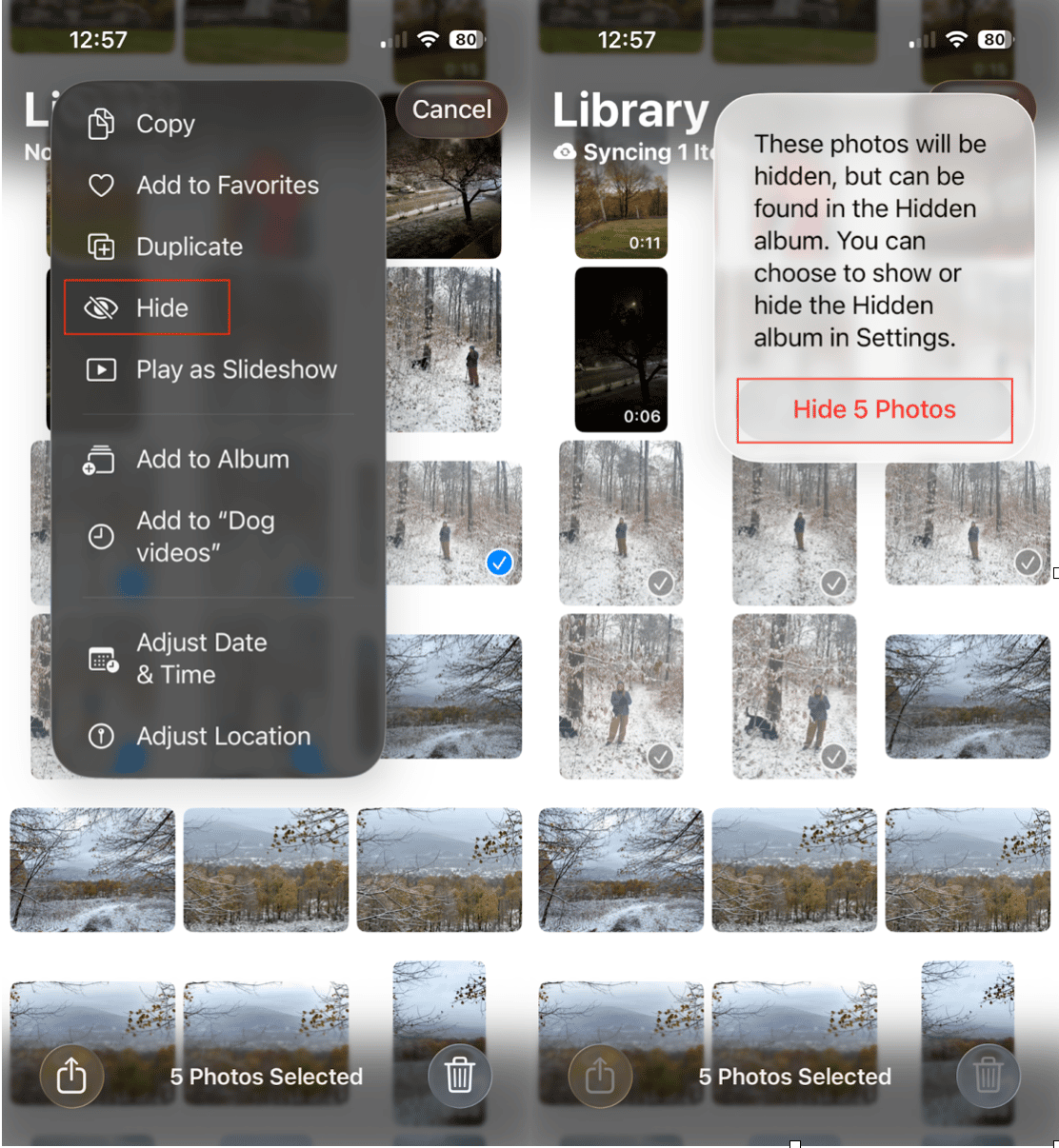 - Choose Hide and confirm your choice. Your photos will be removed from your photo library and moved to the Hidden album.