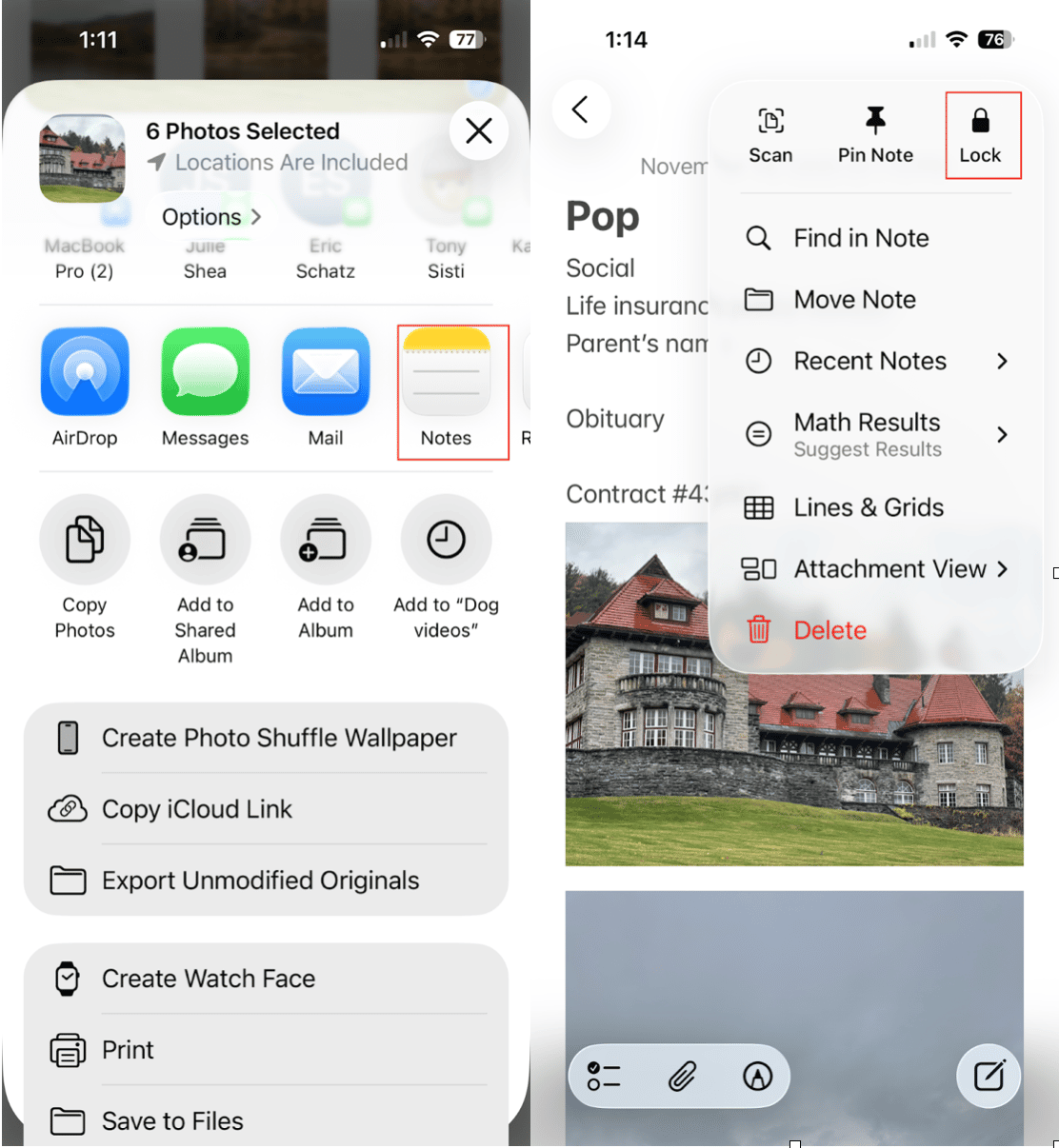The Notes app can also store photos behind a password or Face ID. This is useful if you have a collection of photos that you want to be able to access quickly. You will have to delete these photos from your library once they are secured within the Notes app.