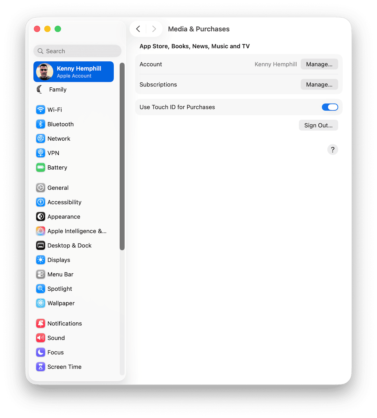 - Sign out of Media & Purchases and back in again. Signing out of Media & Purchases is different from signing out of your Apple ID. In this case, it only affects your ability to play media, such as Apple Music, and to access purchased apps, games, books, and other content.