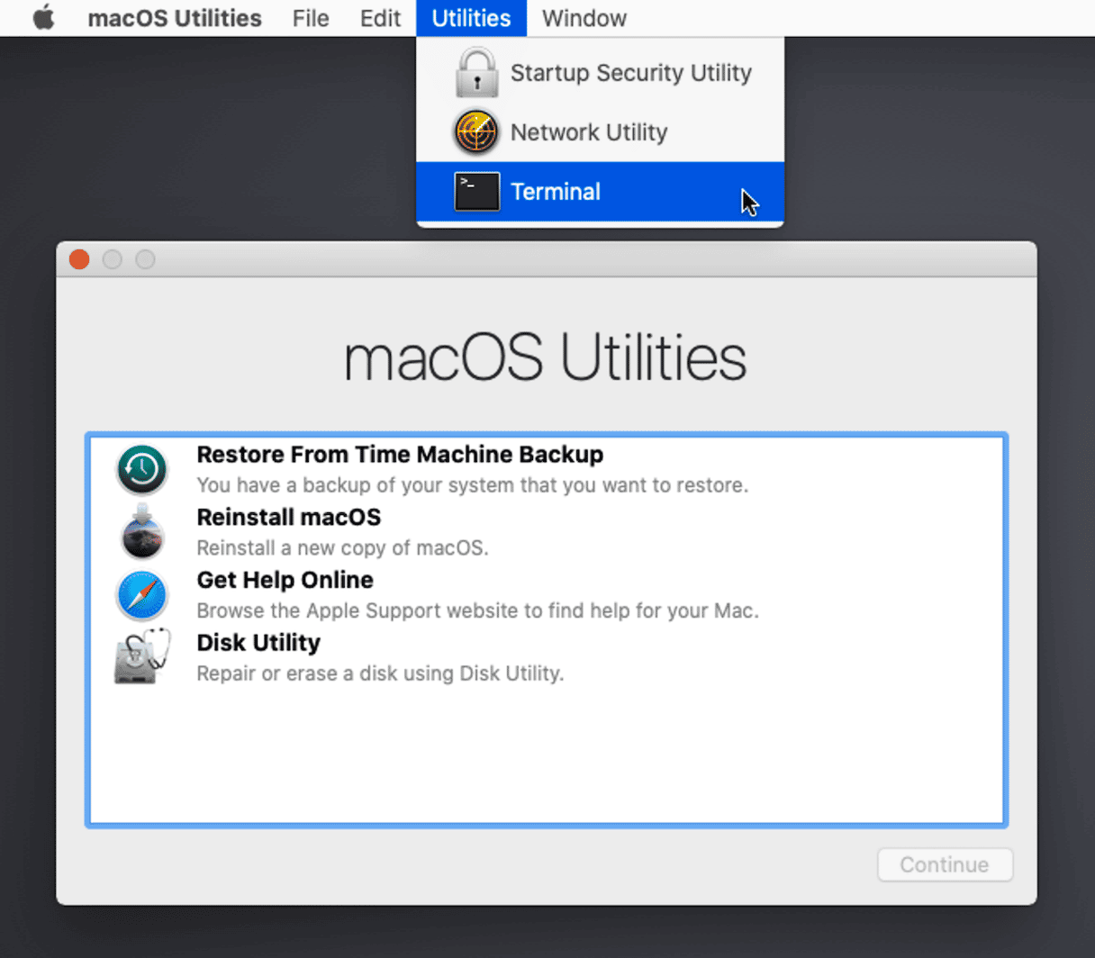 - When macOS Utilities appears on the screen, go to the menu bar and choose Utilities > Terminal.