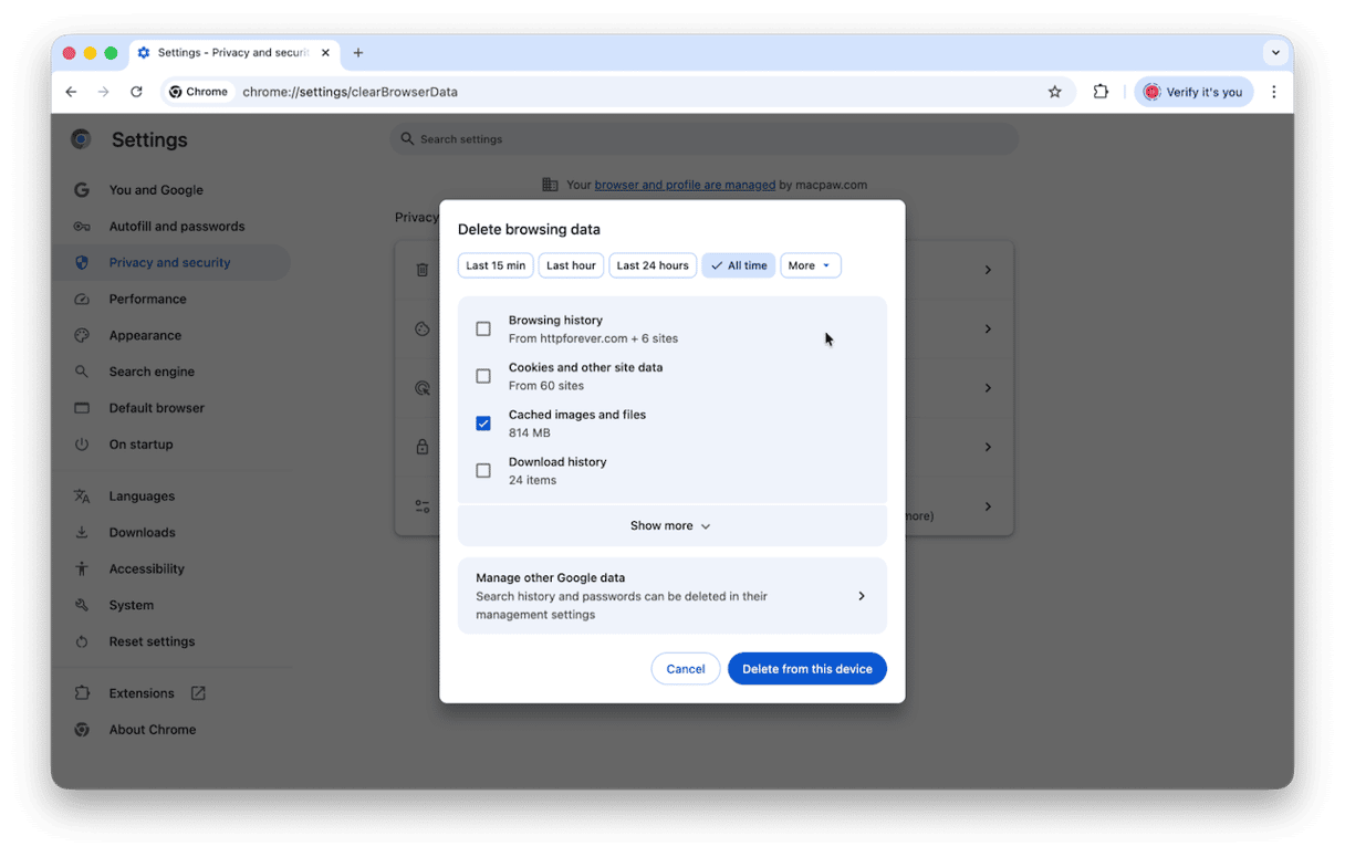 - Go to Chrome Settings > Privacy & Security > Delete browsing data.