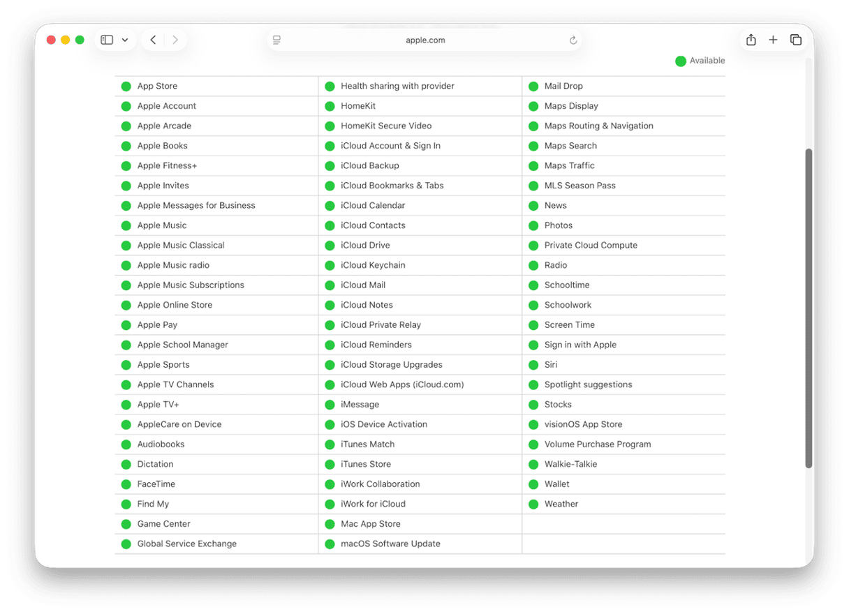 If your internet connection is working fine, it’s possible the problem lies with Apple’s servers. You can check by visiting its status page. Look for macOS Software Update. If the dot next to it is green, it’s working properly. If not, it has a problem, and the only thing you can do is wait for it to be fixed.