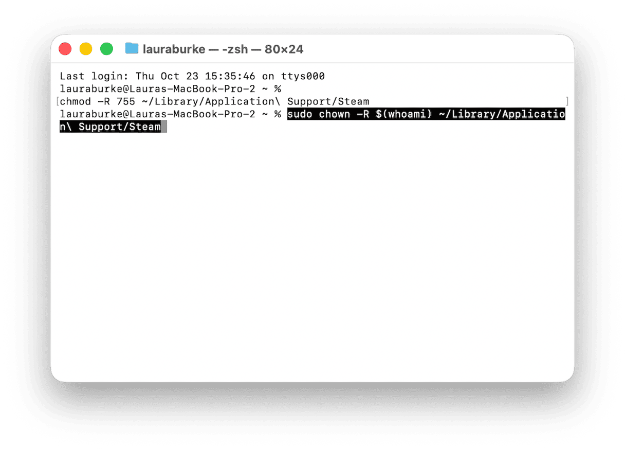 - Then, run this command: sudo chown -R $(whoami) ~/Library/Application\ Support/Steam