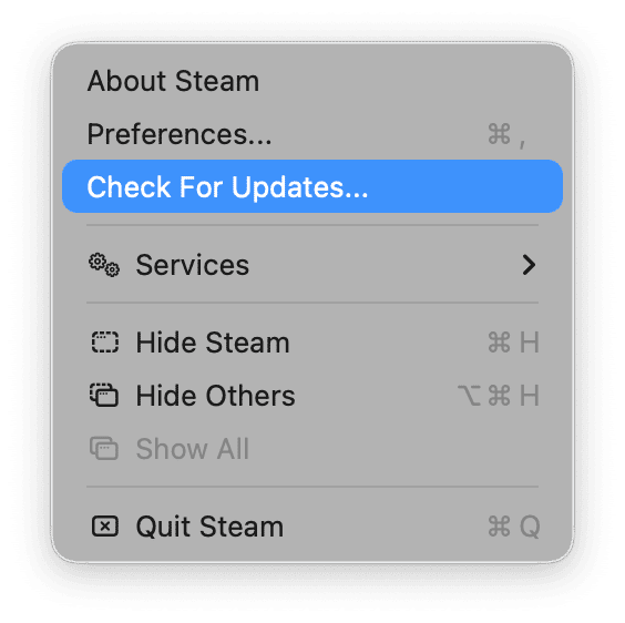 - If Steam opens briefly, select the main Steam menu > Check for Updates.
