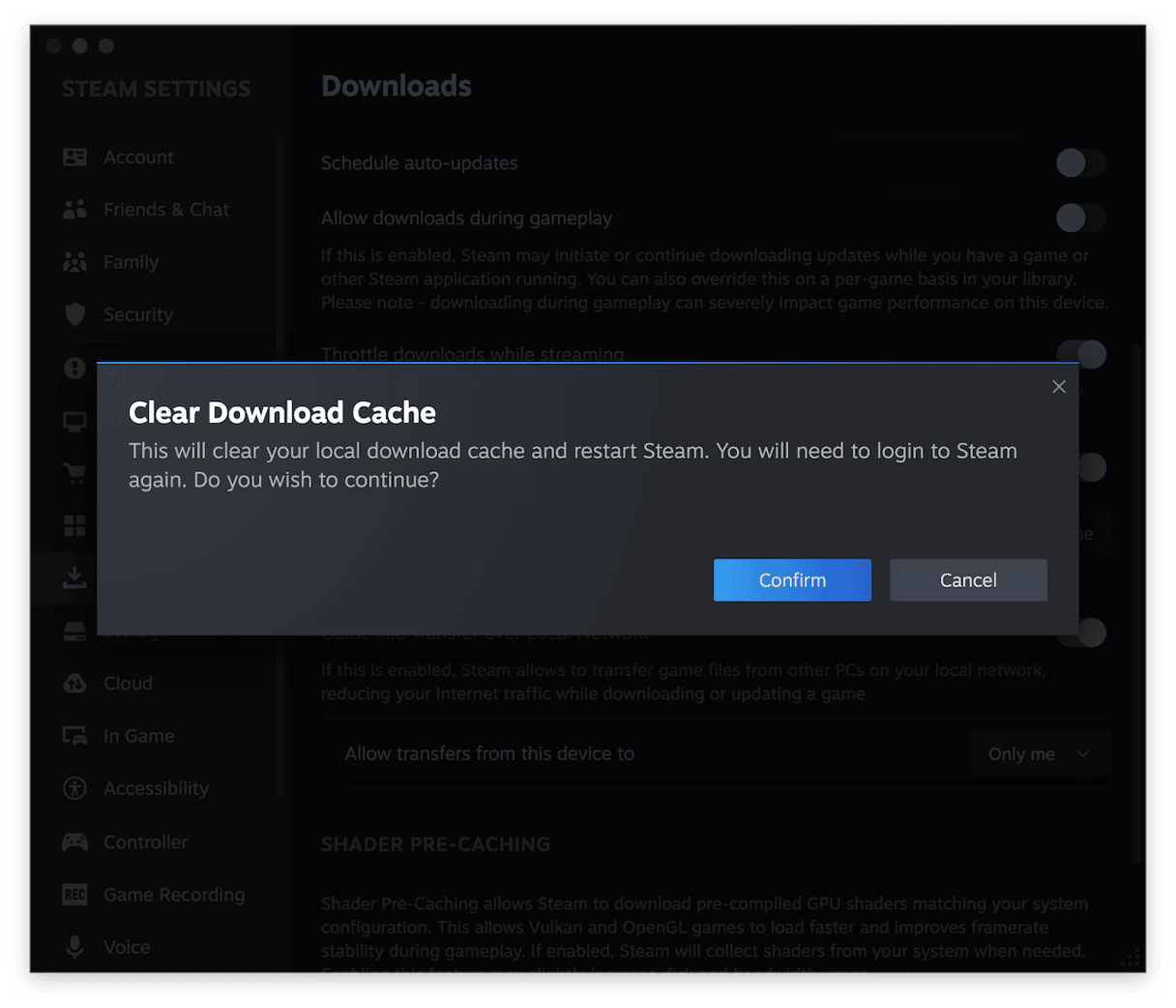 - Open Steam and from the main Steam menu > Preferences > Downloads > Clear Download Cache > Confirm.