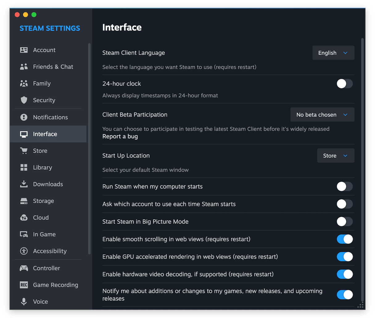 - Open Steam and from the main Steam menu > Preferences > Interface.