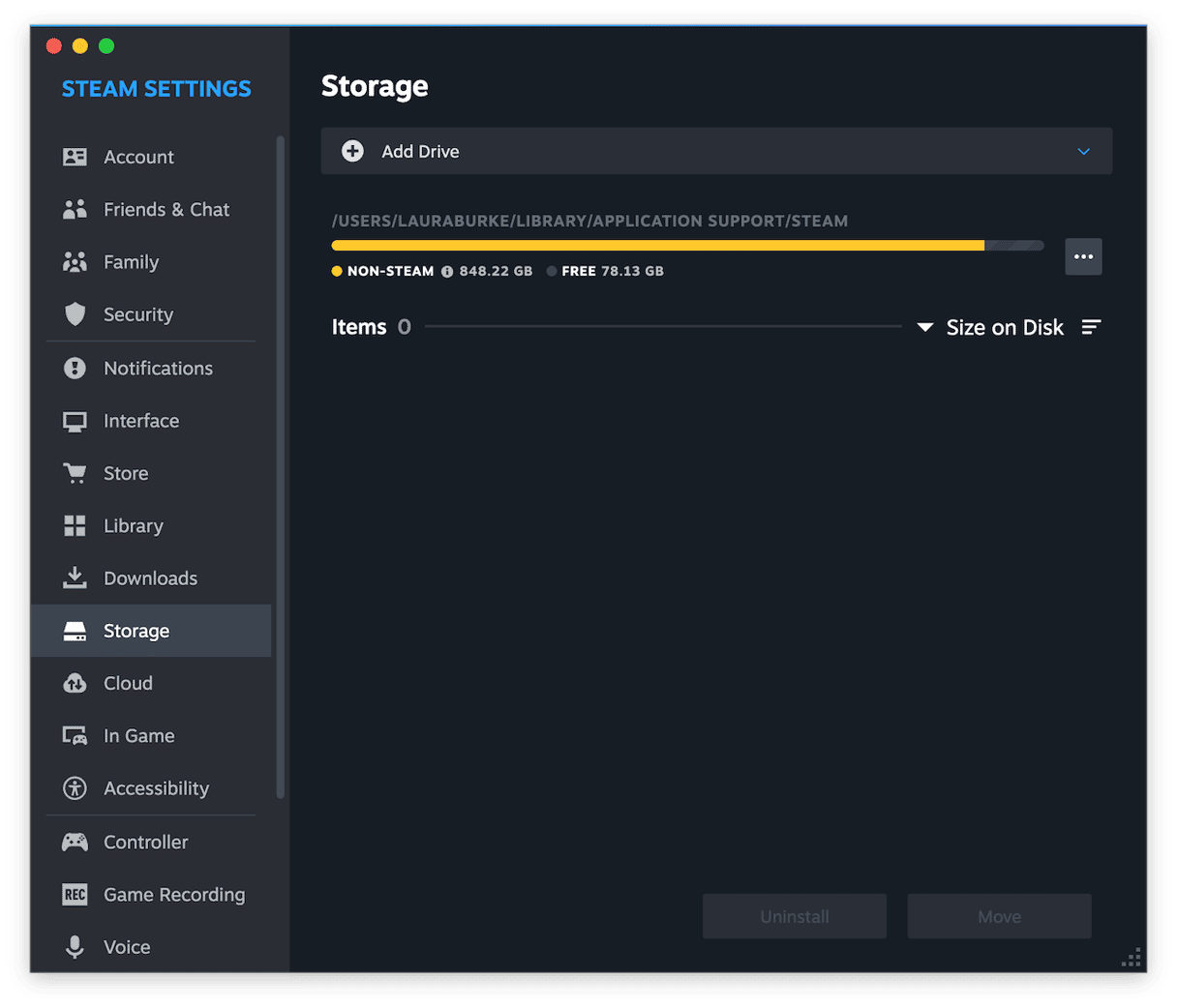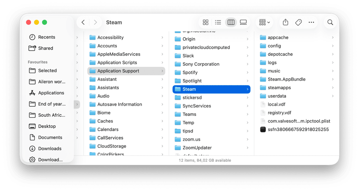 ~/Library/Application Support/Steam, keep the steamapps folder. - Delete everything else in