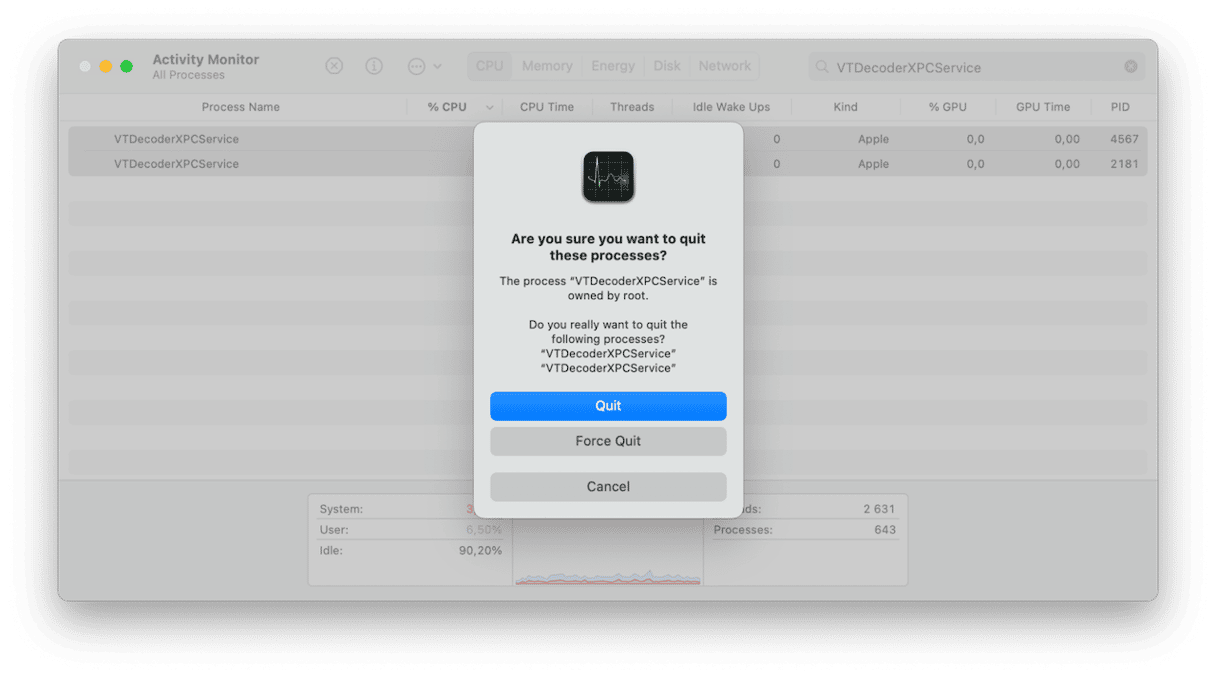 Once you’ve identified that VTDecoderXPCService is the problem, you can select it in Activity Monitor and click the ‘x’ in the toolbar to quit it. Then, quit Activity Monitor.