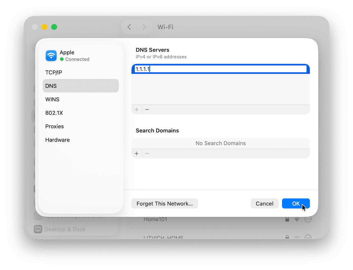 1.1.1.1and1.0.0.1or8.8.8.8and8.8.4.4. Click OK, then Apply. - Start your browser again.