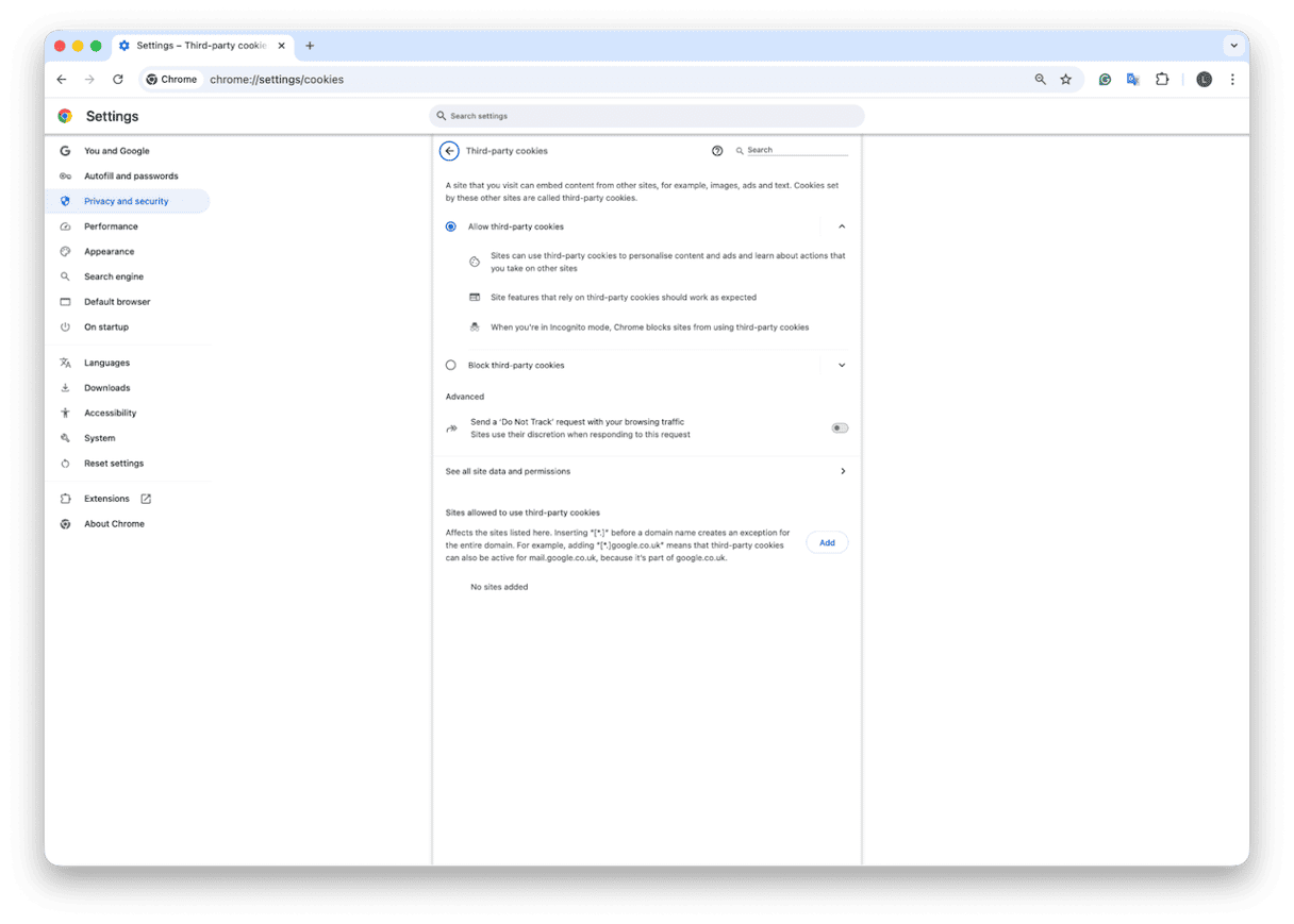 - Open Chrome and from the menu > Settings > Privacy and security > Third-party cookies > See all site data.