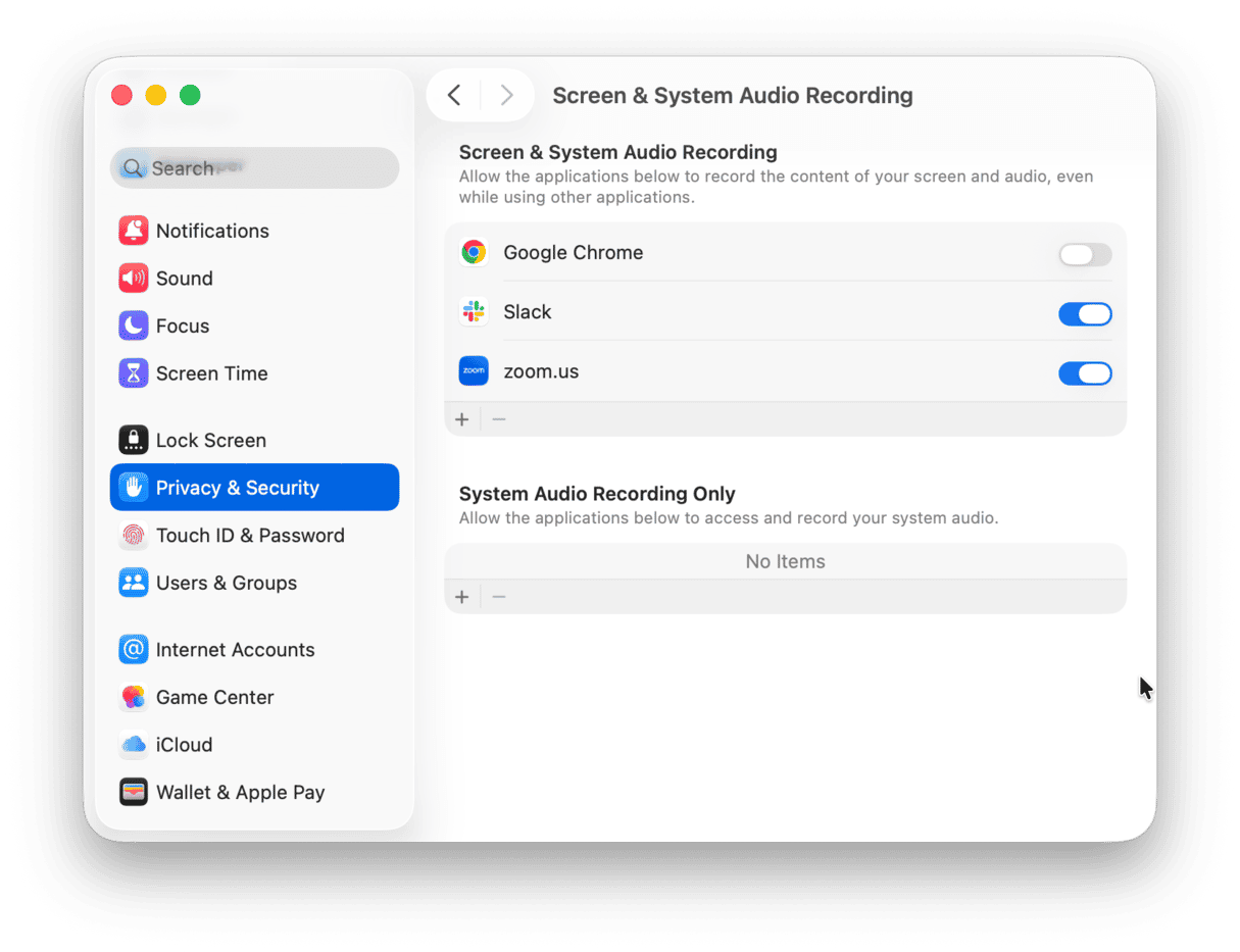 - Go to Apple menu > System Settings > Privacy & Security > Screen & System Audio Recording.