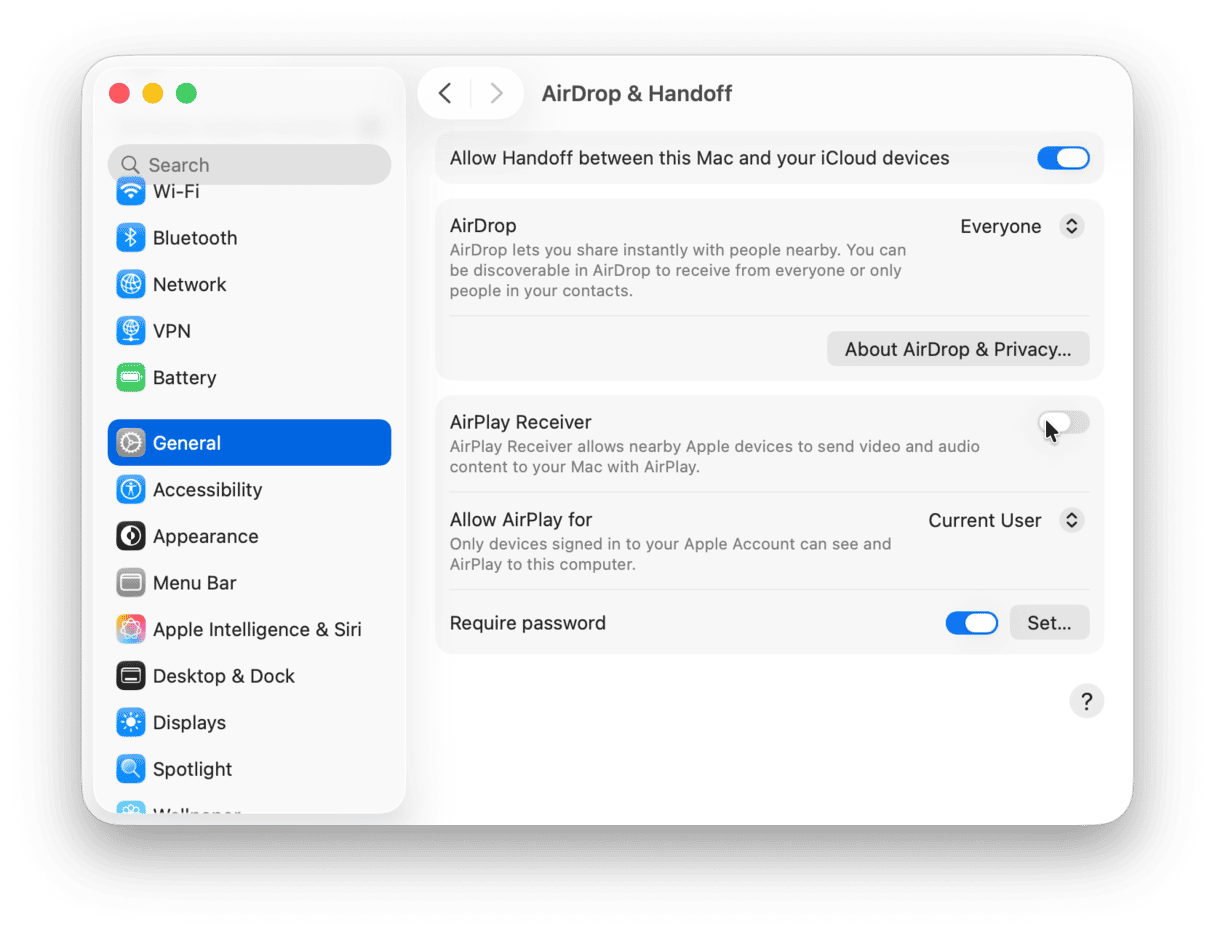 - Turn off AirPlay Receiver if you do not plan to use AirPlay and type in your password to confirm the action.