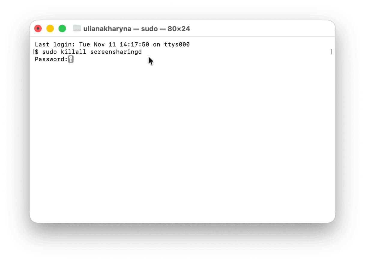 Finally, you can use Terminal to stop all screen sharing activity. The next step simply restarts the screen sharing agent on your Mac, which will close any remaining connections.