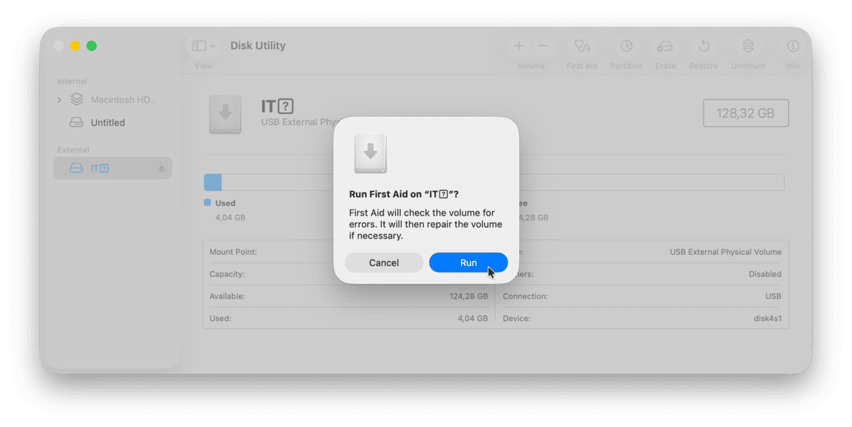 First Aid can also help you fix issues with your Mac’s internal drive. Just select it and hit First Aid > Run.
