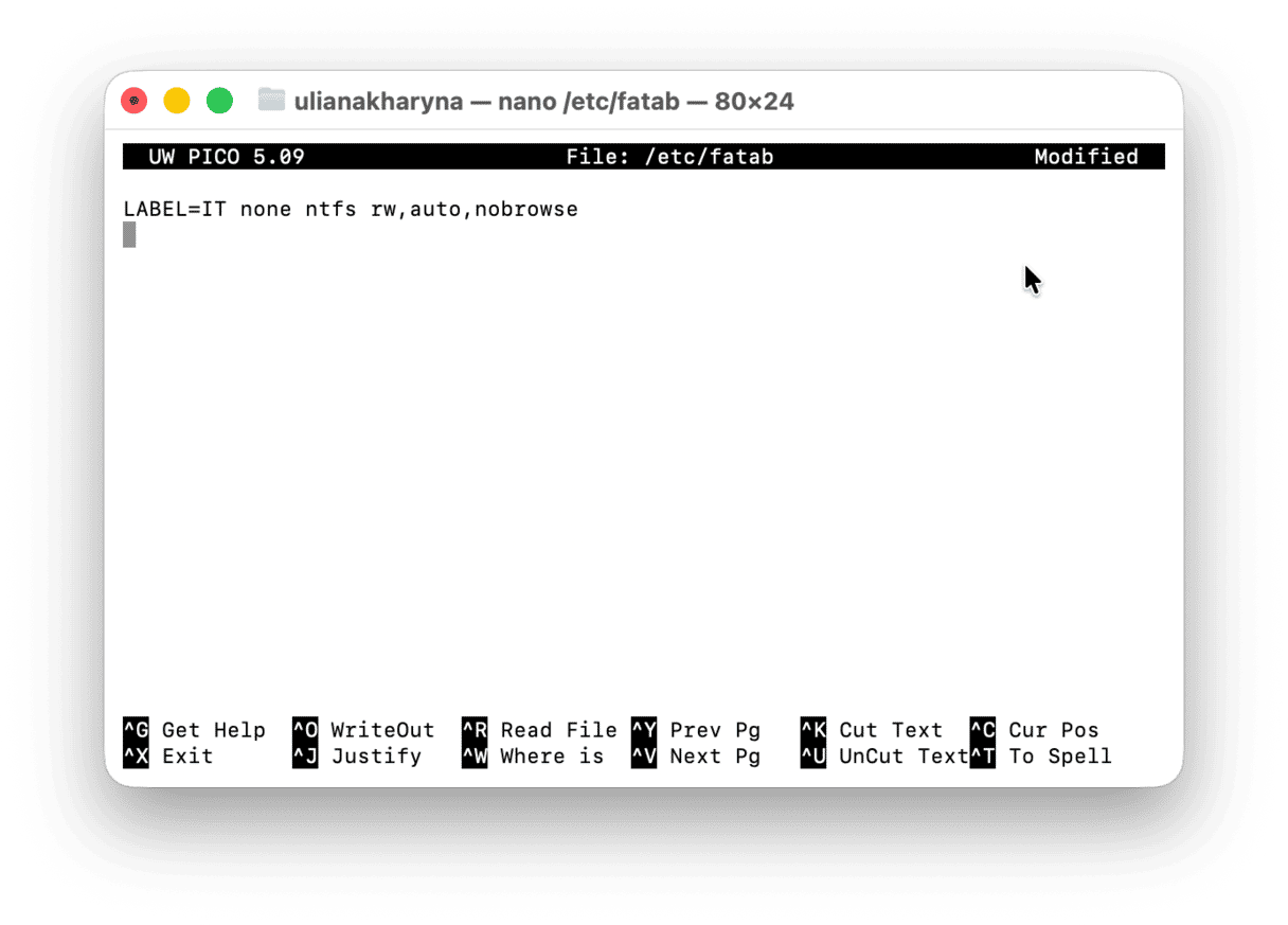 LABEL=DRIVENAME none ntfs rw,auto,nobrowsereplacingDRIVENAMEwith the actual name of your external hard drive. - Press Control + O to save the file and then Control + X to exit.