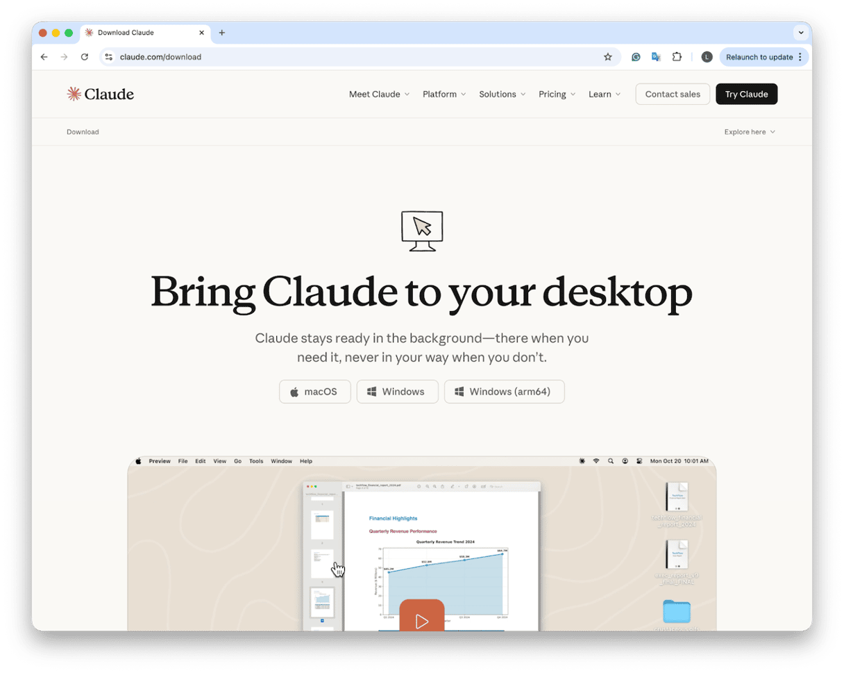 - Claude Desktop app: a simple Mac app where you chat with Claude. Paste code, text, or screenshots. Get answers back in seconds.