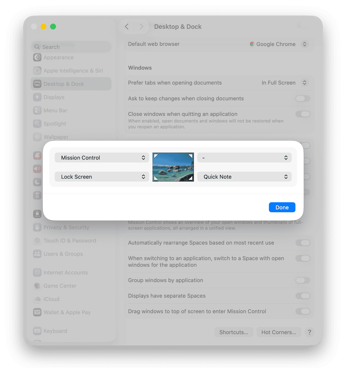 - Optional: Desktop & Dock > Hot Corners button > set one corner to Lock Screen. Flick the mouse there when you step away.