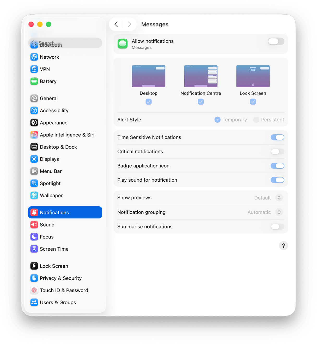 - System Settings > Notifications > Messages.