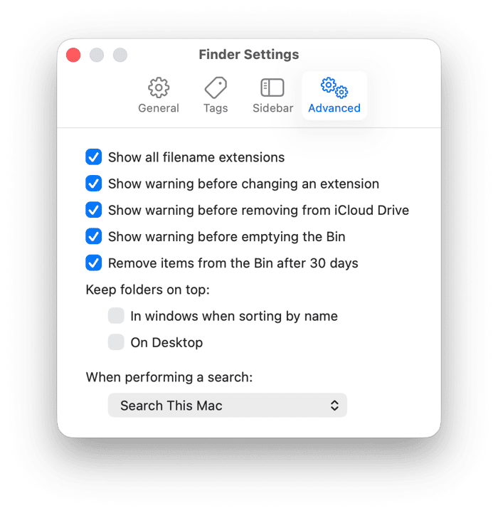 Make it a habit to clear your Trash every week or set your Mac to automatically empty it every 30 days. Just go to Finder > Settings > Advanced and enable this option.