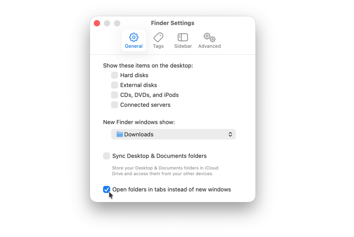 - While you’re there, select the checkbox next to ‘Open folders in tabs instead of new windows’ — that will stop your desktop from becoming cluttered with new Finder windows.