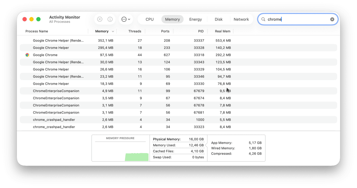 Although Google Chrome is not the one to blame for massive memory usage, it can indeed affect your Mac’s performance. If you use Chrome as your primary browser, you probably have many windows open there. Chrome runs a lot of processes to ensure a fast browsing experience for you. So, it uses your RAM for storing your tabs, plug-ins, and extensions. Look at how many entries Google Chrome has in Activity Monitor: