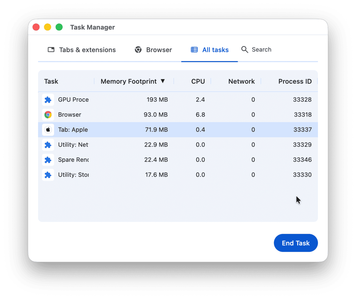 I’ve been using Chrome for some years, only to discover (recently) that Chrome had a task manager of its own. You can use it to force quit memory-heavy processes in the browser. It’s a handy tool because it lets you see how a page weighs on CPU usage on a Mac.