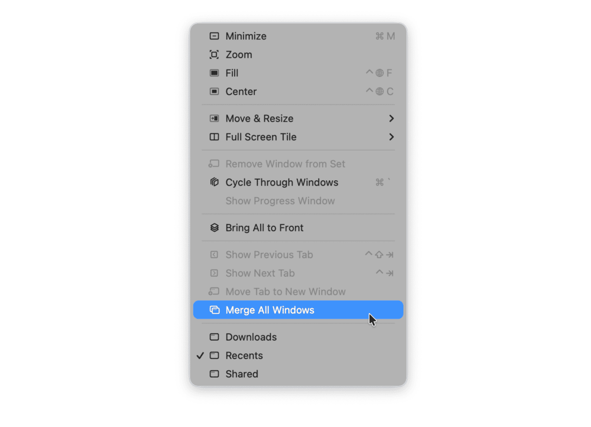 Okay, suppose you’re still asking yourself, “how I clear RAM on my MacBook Pro/MacBook Air?” The next trick is as magical (you’ll see for yourself) as it is time-saving. It’s no secret that each window in the Finder eats up RAM. But how many open windows are there? Some of them are collapsed or stacked in some blind spot on your screen. This Finder command merges all your windows into one. See how to do it: