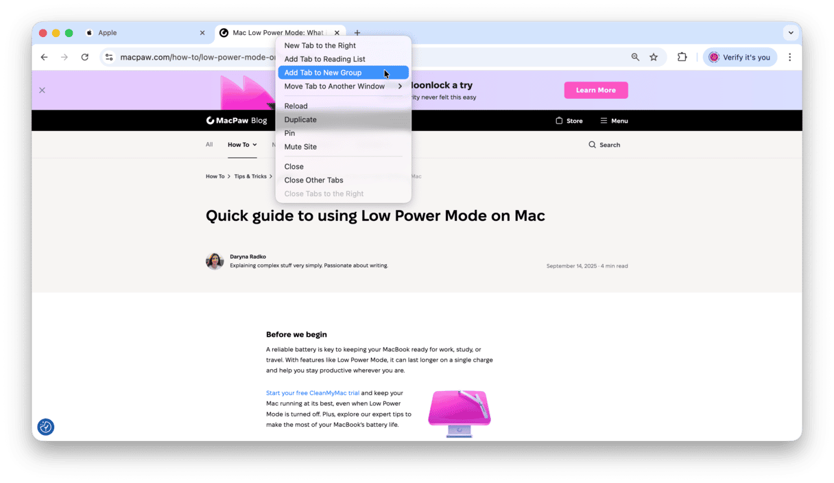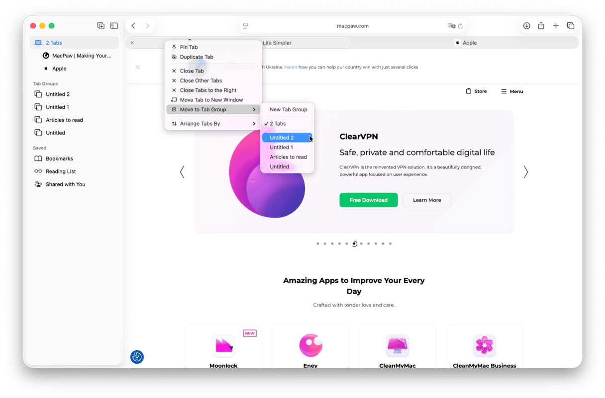 - Right-click a tab, choose Move to Tab Group, and choose the needed option.