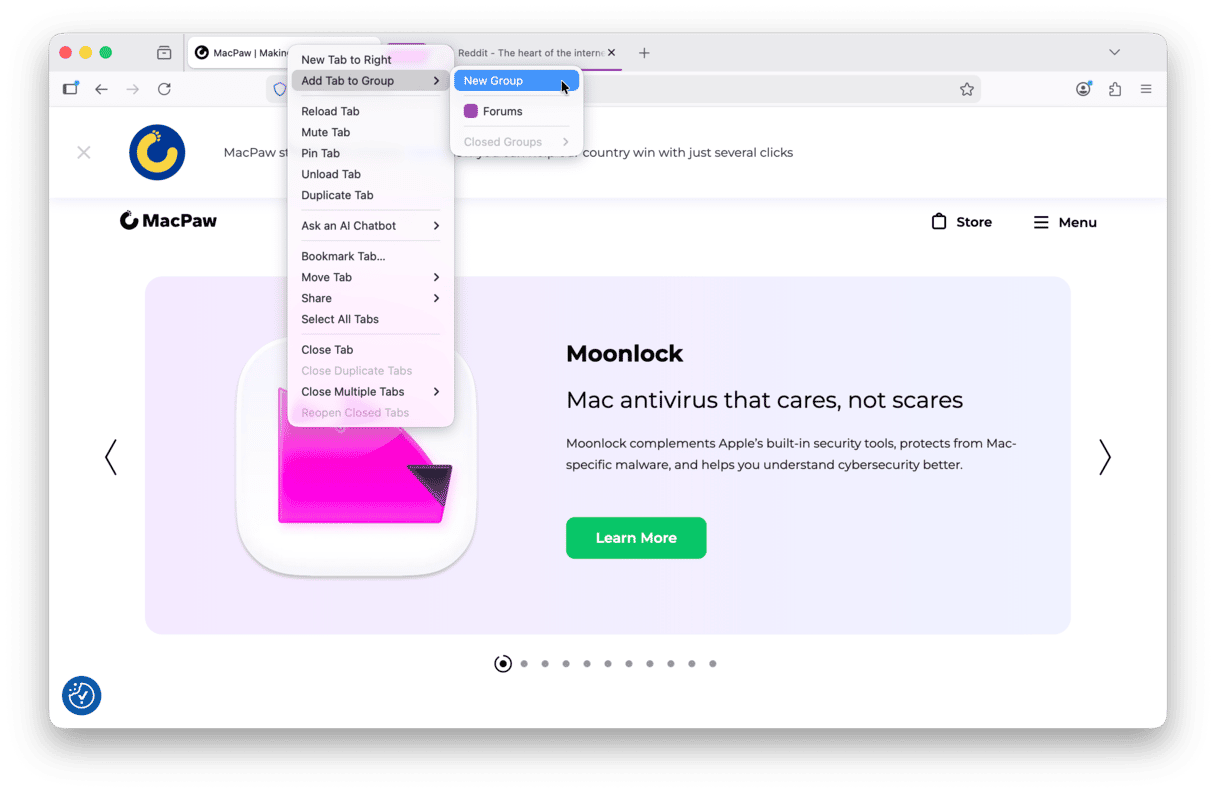 - You can also control-click tabs and send several tabs to a tab group at once.