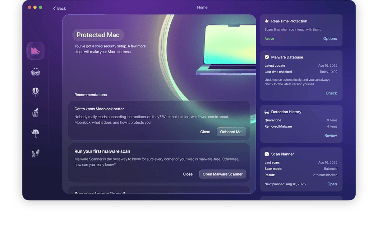 Once your Mac is free of malware, Moonlock’s real-time malware protection will keep watch over your system at all times. From there on, no threat will be able to sneak onto your Mac.