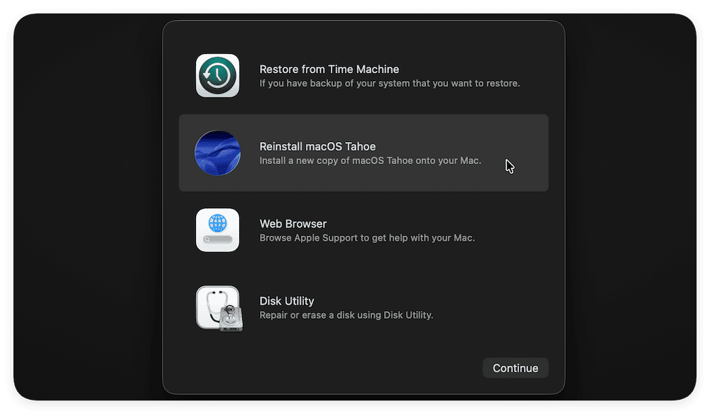 - Boot into recovery mode and from the macOS Utilities menu, choose Reinstall macOS and follow the instructions on the screen.