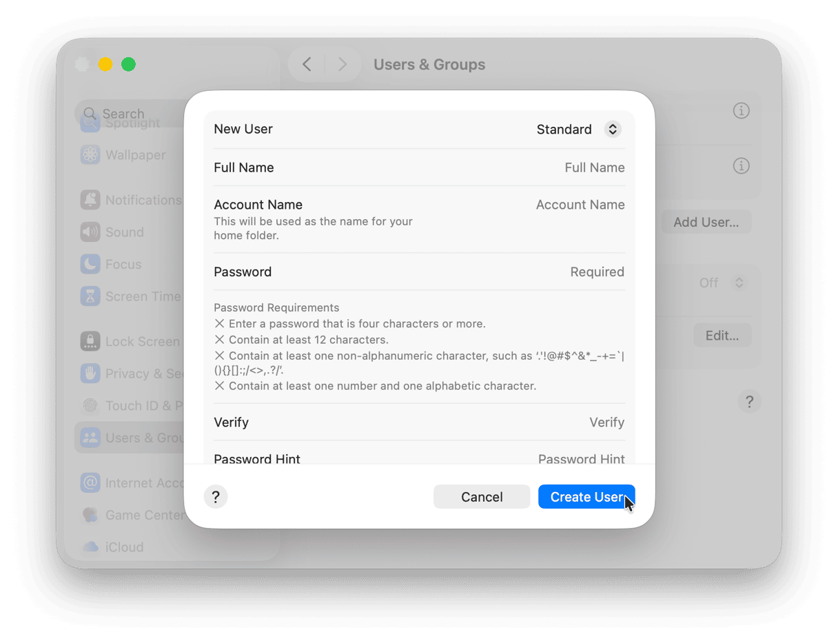 - Whenever possible, use a non-admin account. To create one, go to System Settings > Users & Groups > Add User. Choose Standard next to New User, fill out all details, and click Create User.