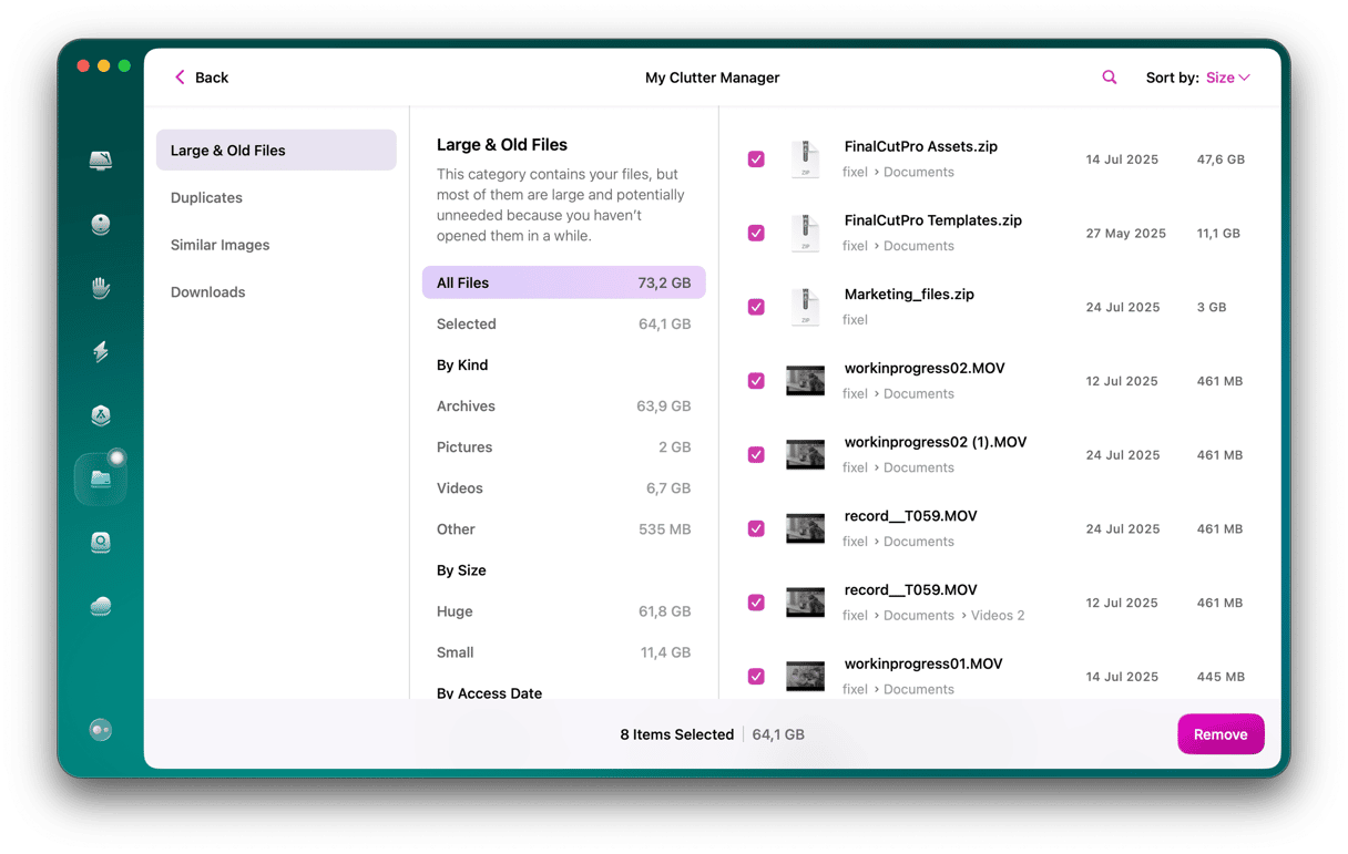 However, that’s not always easy to do. And that’s where CleanMyMac’s My Clutter feature comes in. It has a tool for analyzing the files on your Mac and identifying the largest and oldest ones. You can then filter the results and quickly get a view of the files that you haven’t opened in a while, or the files that are taking up the most space. You can then decide whether to archive them on an external disk and then delete them with a click in My Clutter.
